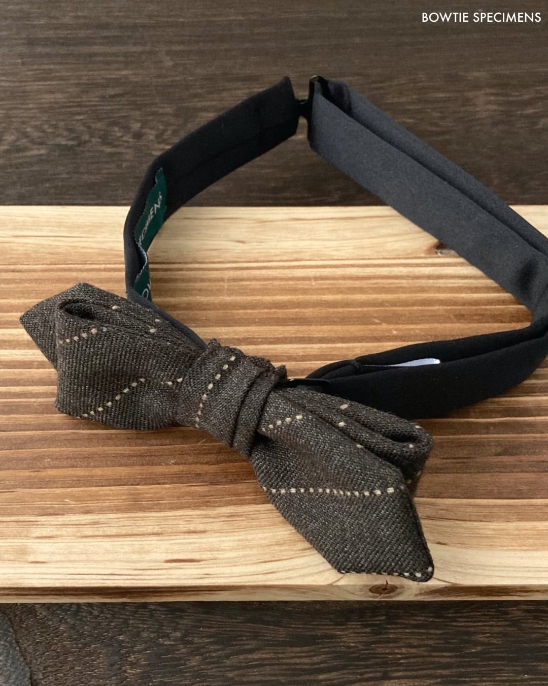 ★蝶ネクタイ ブランド「ボウタイ スペシメンズ」の作り結び蝶ネクタイ 。「作り結び」とは、予め結び目が縫って形作られているもののことで、ワンタッチで手軽に取り外しができます。