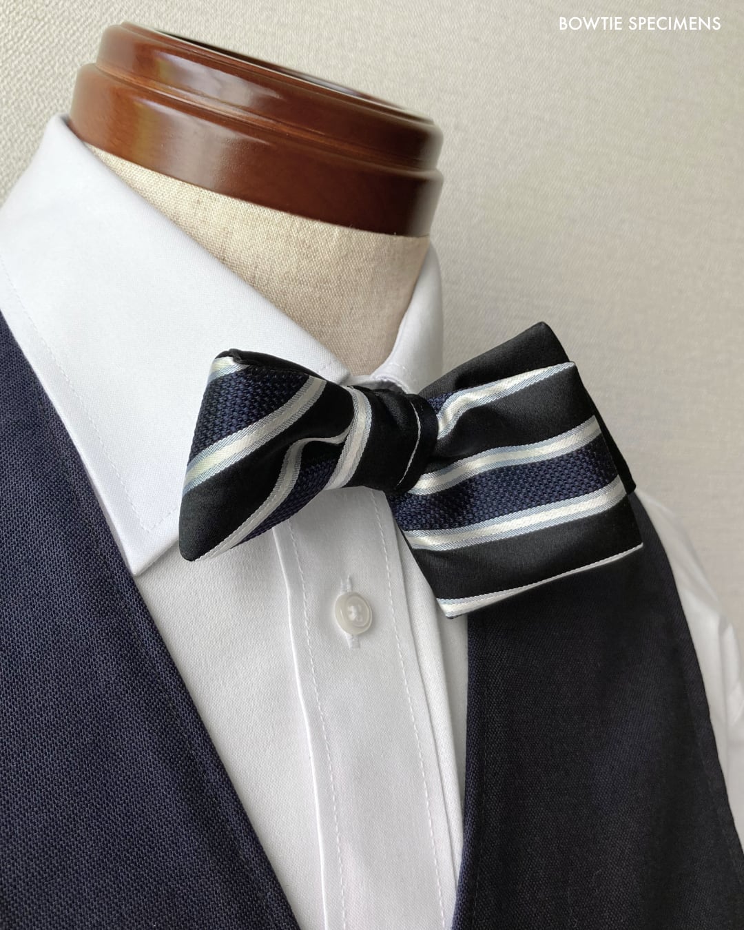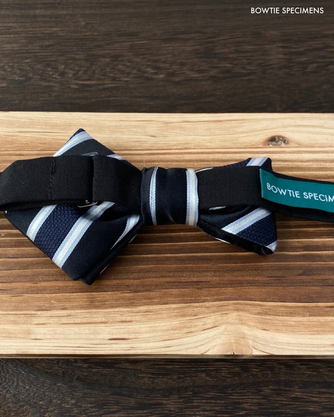 ★蝶ネクタイ ブランド「ボウタイ スペシメンズ」の作り結び蝶ネクタイ 。「作り結び」とは、予め結び目が縫って形作られているもののことで、ワンタッチで手軽に取り外しができます。