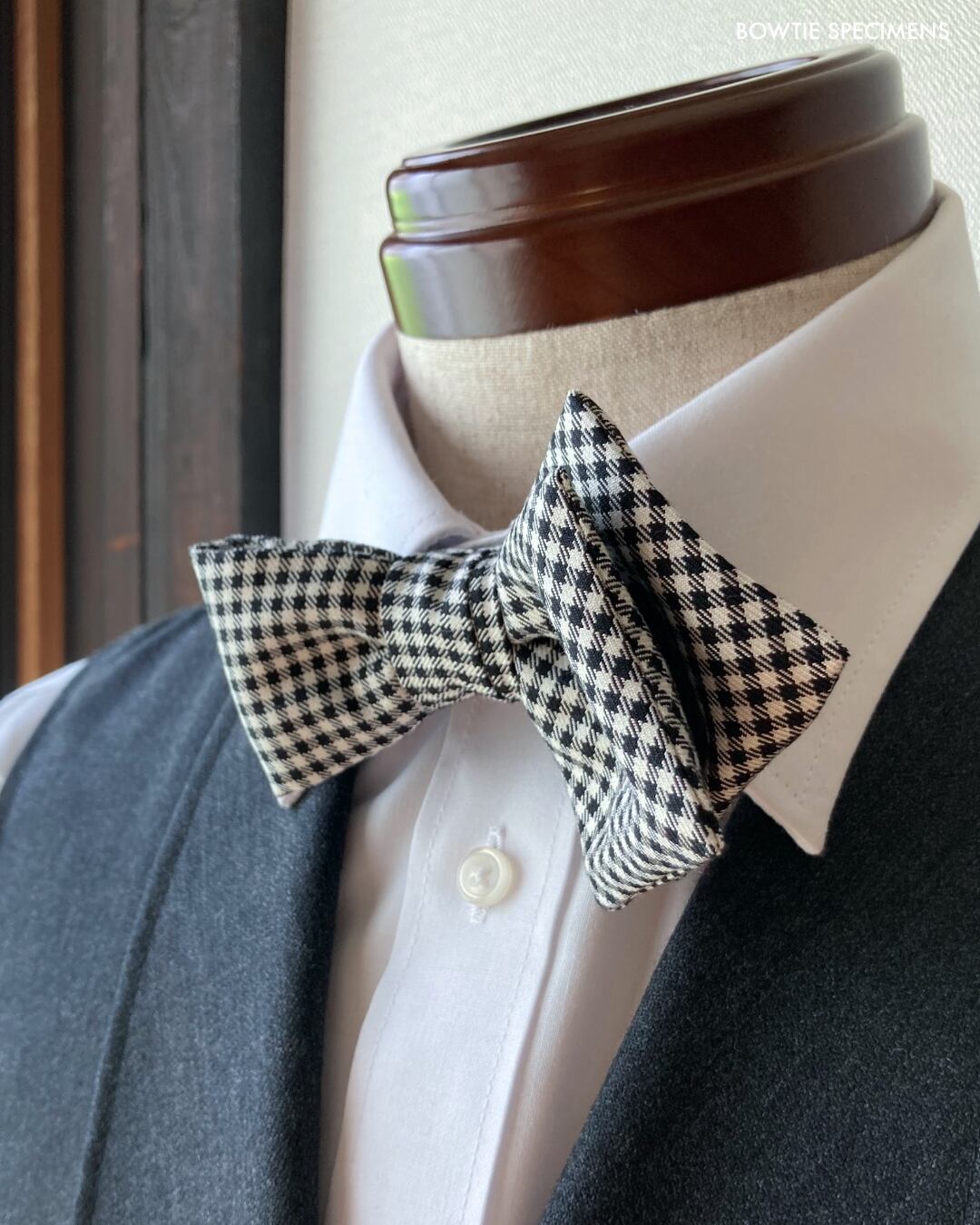 ★蝶ネクタイ ブランド「ボウタイ スペシメンズ」の作り結び蝶ネクタイ 。「作り結び」とは、予め結び目が縫って形作られているもののことで、ワンタッチで手軽に取り外しができます。