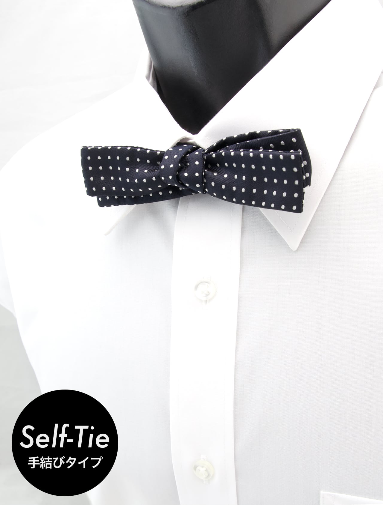 蝶ネクタイは一般的に、自分で結ぶ「手結び式(Self-Tie)」と、あらかじめ結び縫われてある「作り結び式(Pre-Tied)」の2種類があります。また、この2種類の機能を融合した「2WAY式」もあり、この商品でも採用しています。