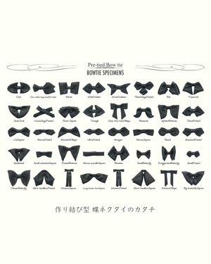★蝶ネクタイ ブランド「ボウタイ スペシメンズ」の作り結び蝶ネクタイ 。「作り結び」とは、予め結び目が縫って形作られているもののことで、ワンタッチで手軽に取り外しができます。