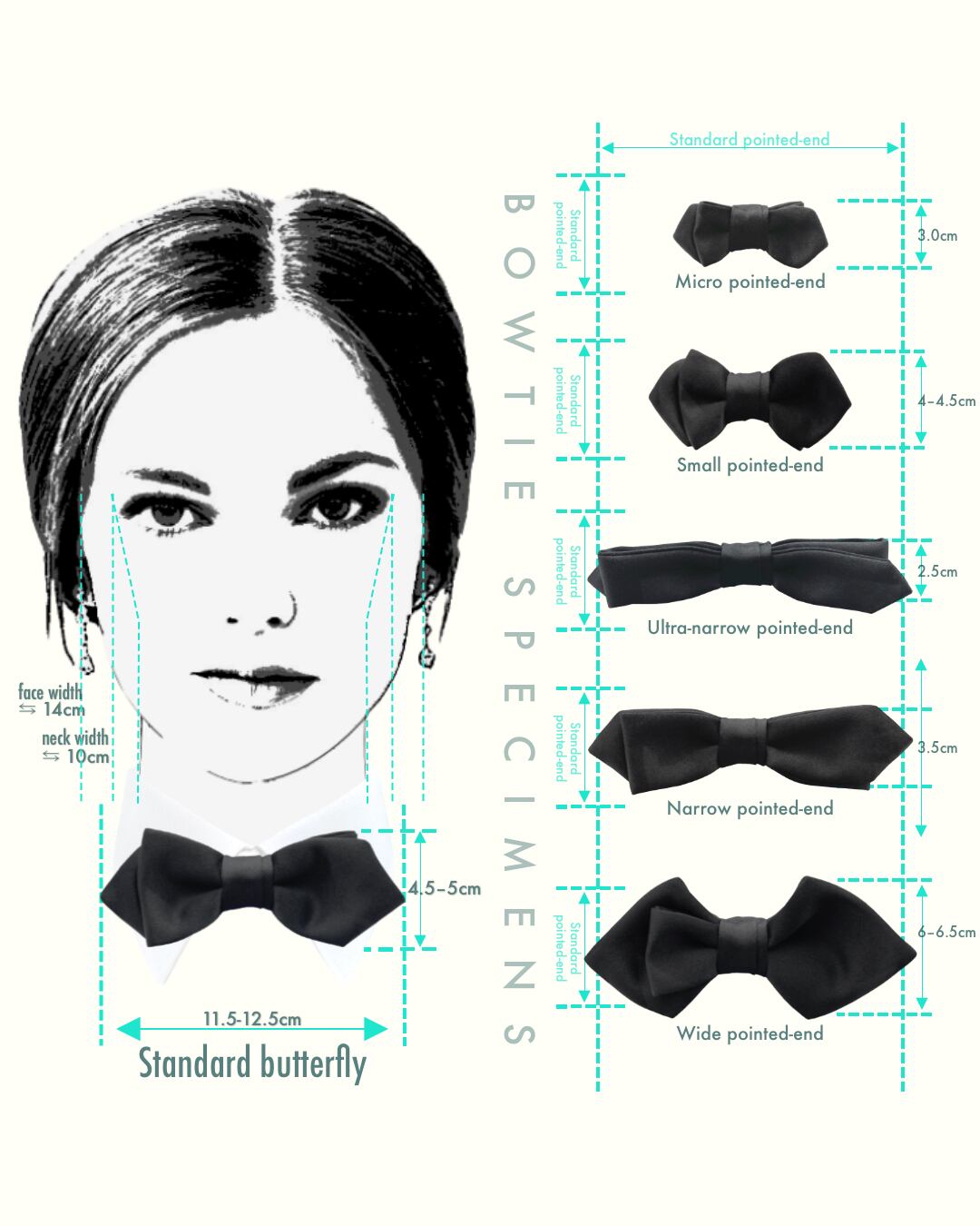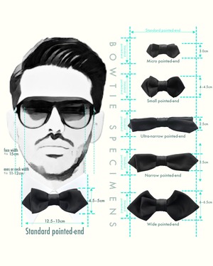 ★このような細幅のポインテッドエンド形状を結ぶと、シャープでクールな印象を与えると同時に、メガネやサングラス選びと同じように、キリッとした印象になります。蝶ネクタイそのもので主張しすぎないようにしつつも、独自スタイルのコーディネートを行えるデザインです。