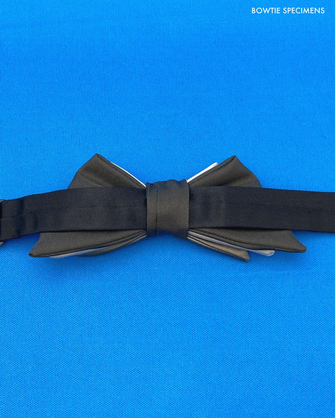 ★「スタンダード・オブリークエンド形」は、先端が斜めにカットされた デザインです。歴史的にこのようなデザインのネックウェアは、ナイフカットタイと呼ばれるネクタイ(ほぼ絶滅)や、タキシード用のクロスタイ(Crossover Tie)、女性用のリボン型ネックウェアなどにも採用されてきました。最近では海外でオブリークエンド形の手結び蝶ネクタイを販売しているブランドも確認していますが、圧倒的にレアなアイテムと言えます。