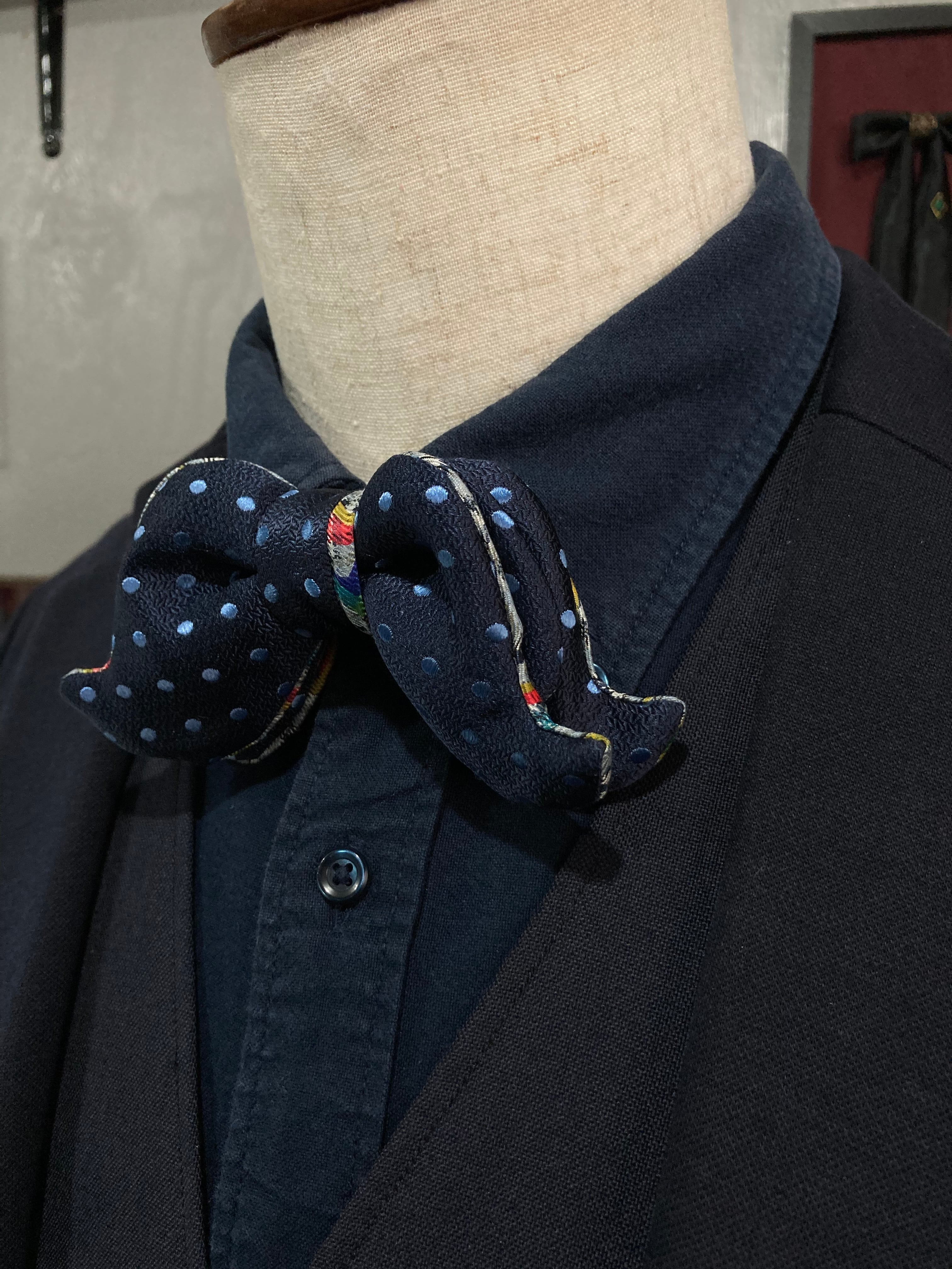 ★蝶ネクタイ ブランド「ボウタイ スペシメンズ」の作り結び蝶ネクタイ 。「作り結び」とは、予め結び目が縫って形作られているもののことで、ワンタッチで手軽に取り外しができます。