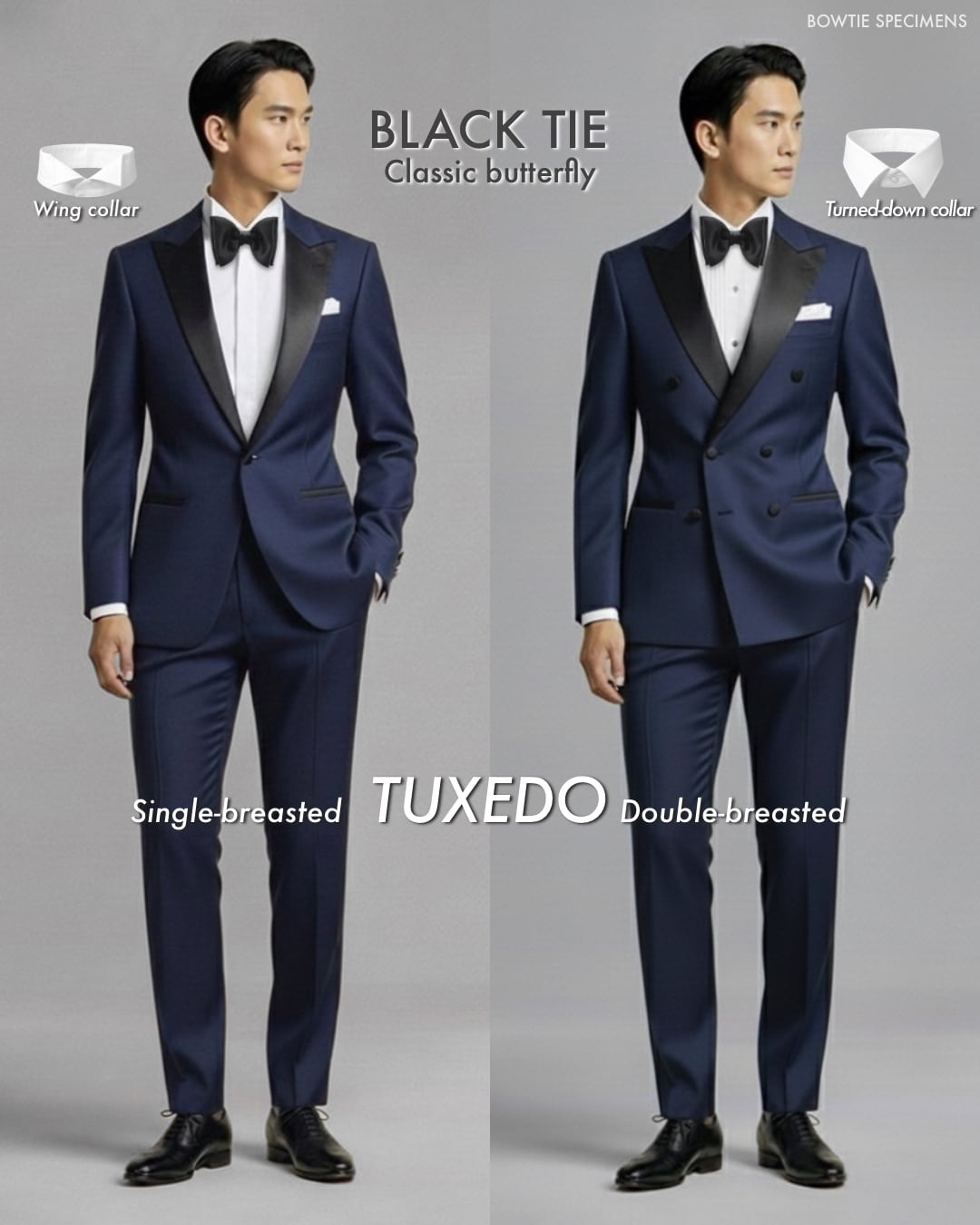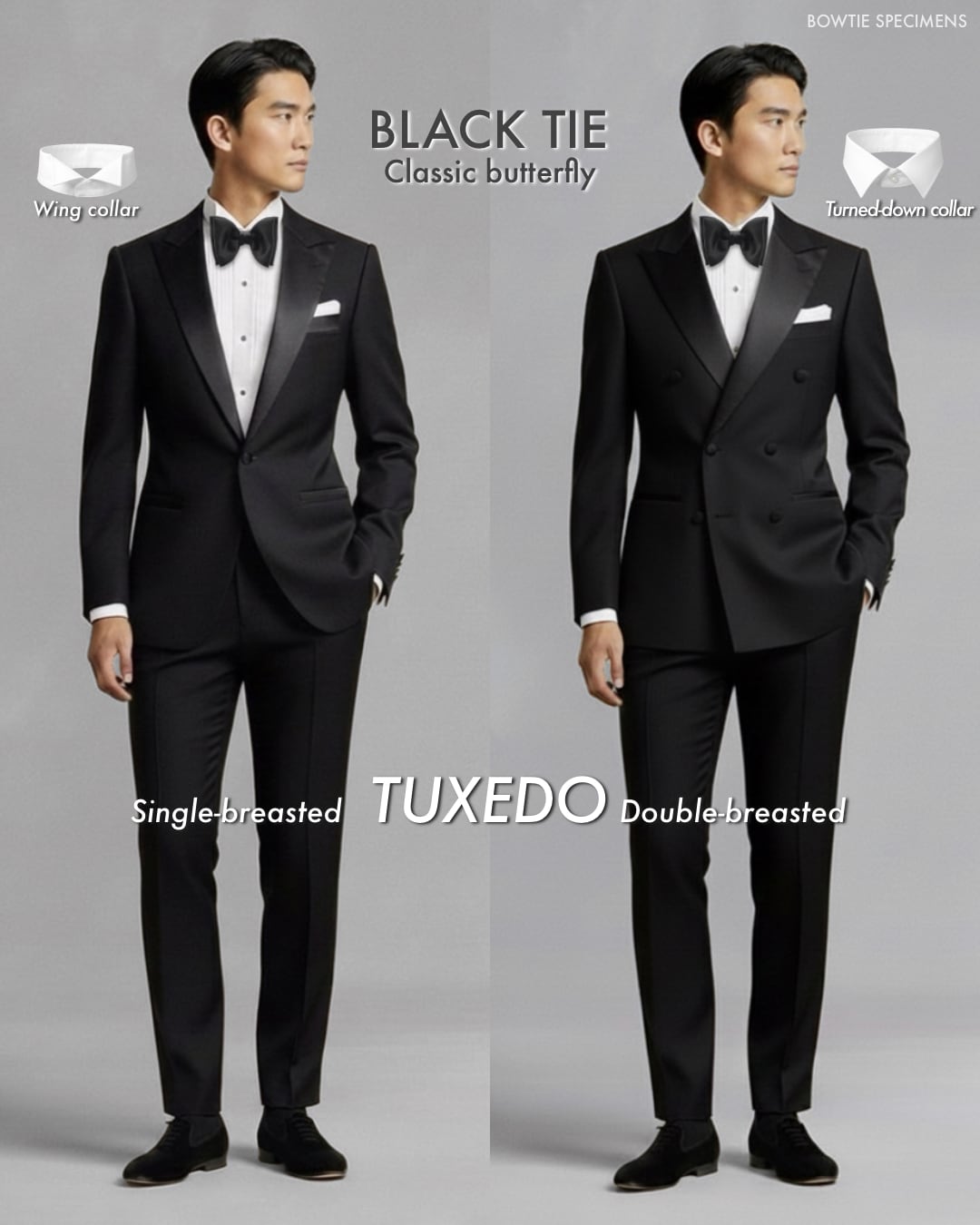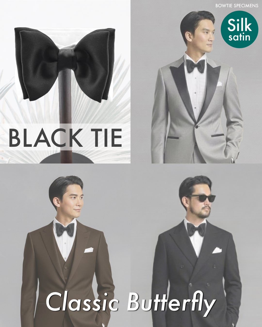 ・20世紀に入り欧米では、「ドレスコード(服装規定)」というものが作られました。その中で「黒の蝶ネクタイ(特にサテン地)」は、「ブラックタイ(夜間準礼装)」という服装のシンボルとなりました。ブラックタイとは、タキシード(ディナースーツ)を着るスタイルのことで、元来は細かなルールが定められています。
