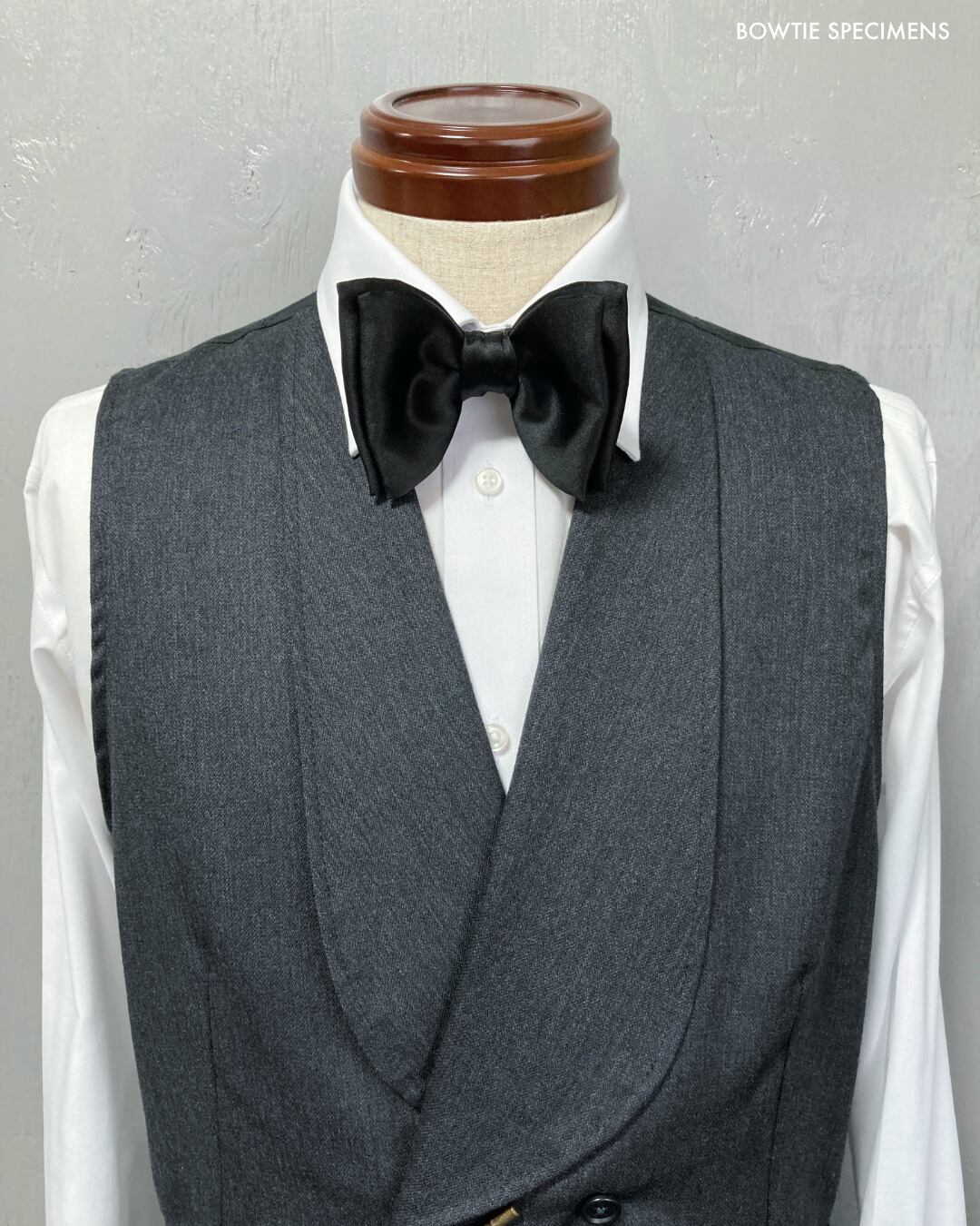 現代では、フォーマルな場面で服装の略式化が進み、特に日本国内において庶民が「燕尾服」や「タキシード」を着用する機会はほとんど皆無に近く、また所有している人も稀です。当ブランドとしては、そんな時代の流れの中でも、普通のスーツに「黒の蝶ネクタイ」を結ぶことは、逆にフォーマル度を演出する1つの手段であると考えています。