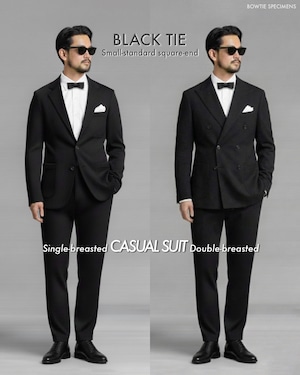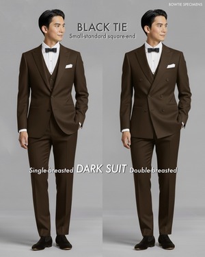 ・昼夜を問わず、燕尾服(えんびふく)に「白ピケ織の蝶ネクタイ」を結ぶ、「ホワイトタイ(第一礼装)」の略式という位置付けになっています。昼間の準礼装である「モーニングスーツ」と同等です。ちなみにモーニングスーツには、ネクタイやアスコットタイを結ぶことになっています。歴史的には蝶ネクタイを結んでいたこともあったようですが。