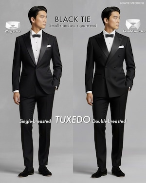 ・20世紀に入り欧米では、「ドレスコード(服装規定)」というものが作られました。その中で「黒の蝶ネクタイ(特にサテン地)」は、「ブラックタイ(夜間準礼装)」という服装のシンボルとなりました。ブラックタイとは、タキシード(ディナースーツ)を着るスタイルのことで、元来は細かなルールが定められています。