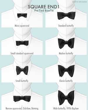 ★小型のスクエアエンドを結んだ際の見た目は、遊び心がありユニークな印象になります。独自スタイルのコーディネートを楽しめるデザインです。フォーマルな場面はもちろん、カジュアルな着こなしをもう少しドレスアップしたい時に、蝶ネクタイは最適です。