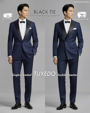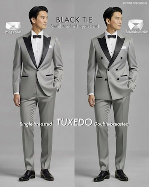 ・タキシードは、慶事(祝い事)でのみ着用します。シャツの襟の形は、「ウィングカラー」または「タウンダウンカラー(折り襟)」のものを着用するルールがあります。折り襟とは、普通の折り返すタイプの襟のことですが、ボタンダウンカラーなど、機能性を重視して作られたものは含みません。