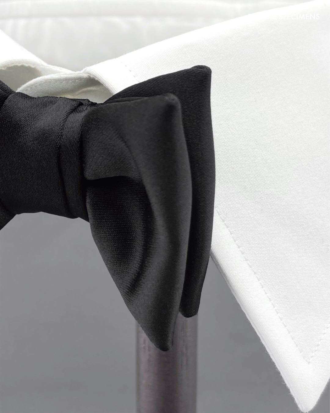現代は服装の略式化が進み、特に日本国内において、庶民が「燕尾服」や「タキシード」を着用する機会はほとんどありません。当ブランドとしては、そんな時代の流れの中でも、夜間のパーティー等で、ダークスーツに「黒の蝶ネクタイ」を結ぶことは、逆にフォーマル度を上げる1つのアイテムであると考えています。