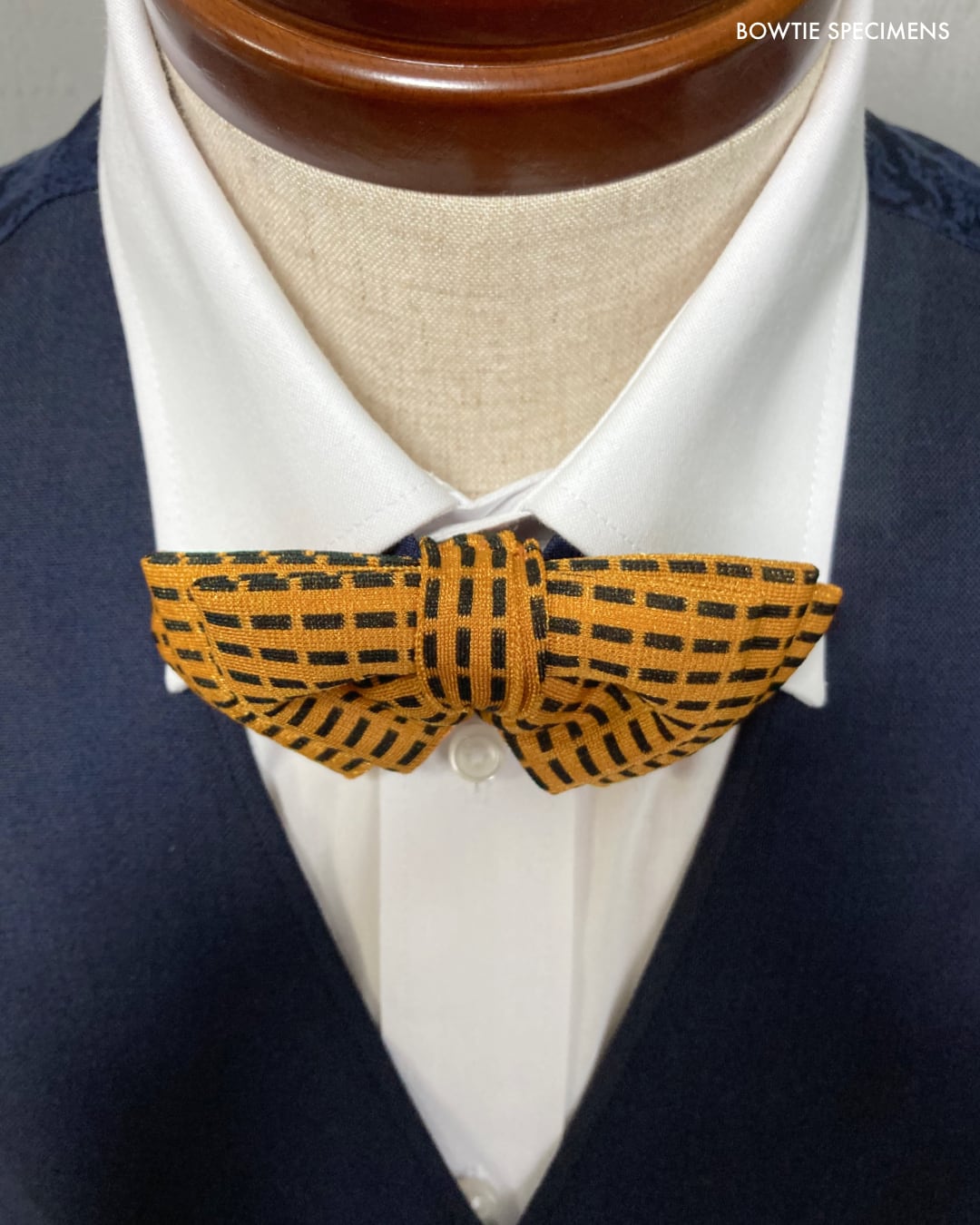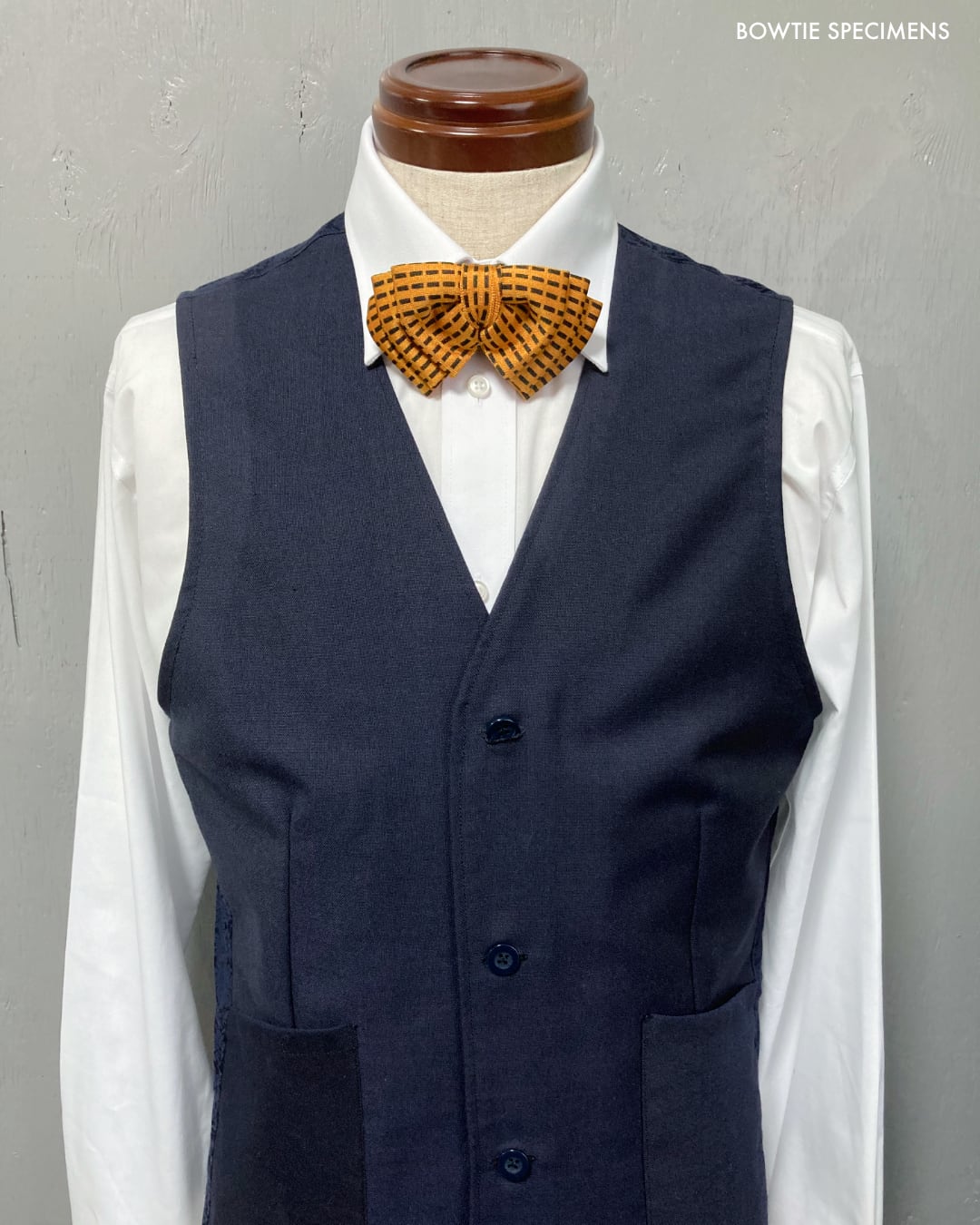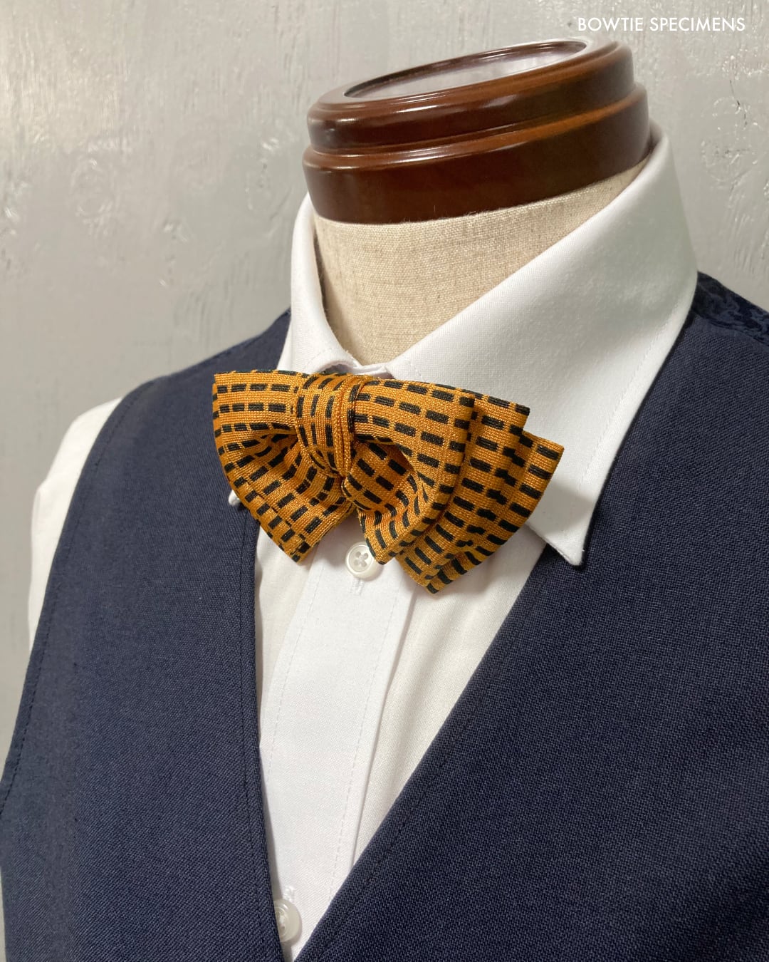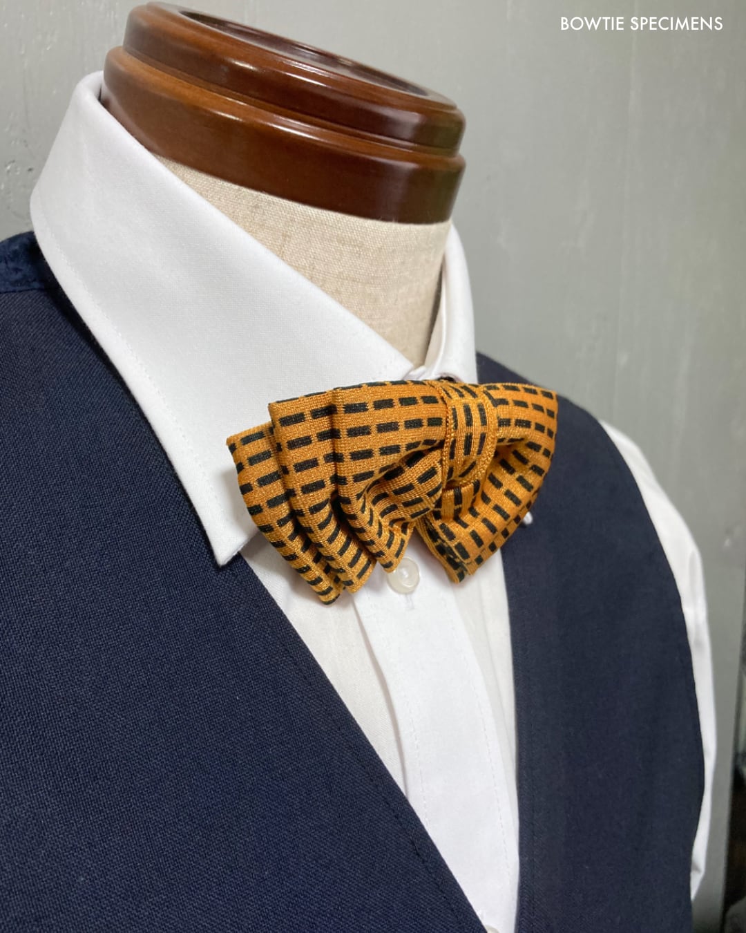 ★蝶ネクタイ ブランド「ボウタイ スペシメンズ」の作り結び蝶ネクタイ 。「作り結び」とは、予め結び目が縫って形作られているもののことで、ワンタッチで手軽に取り外しができます。