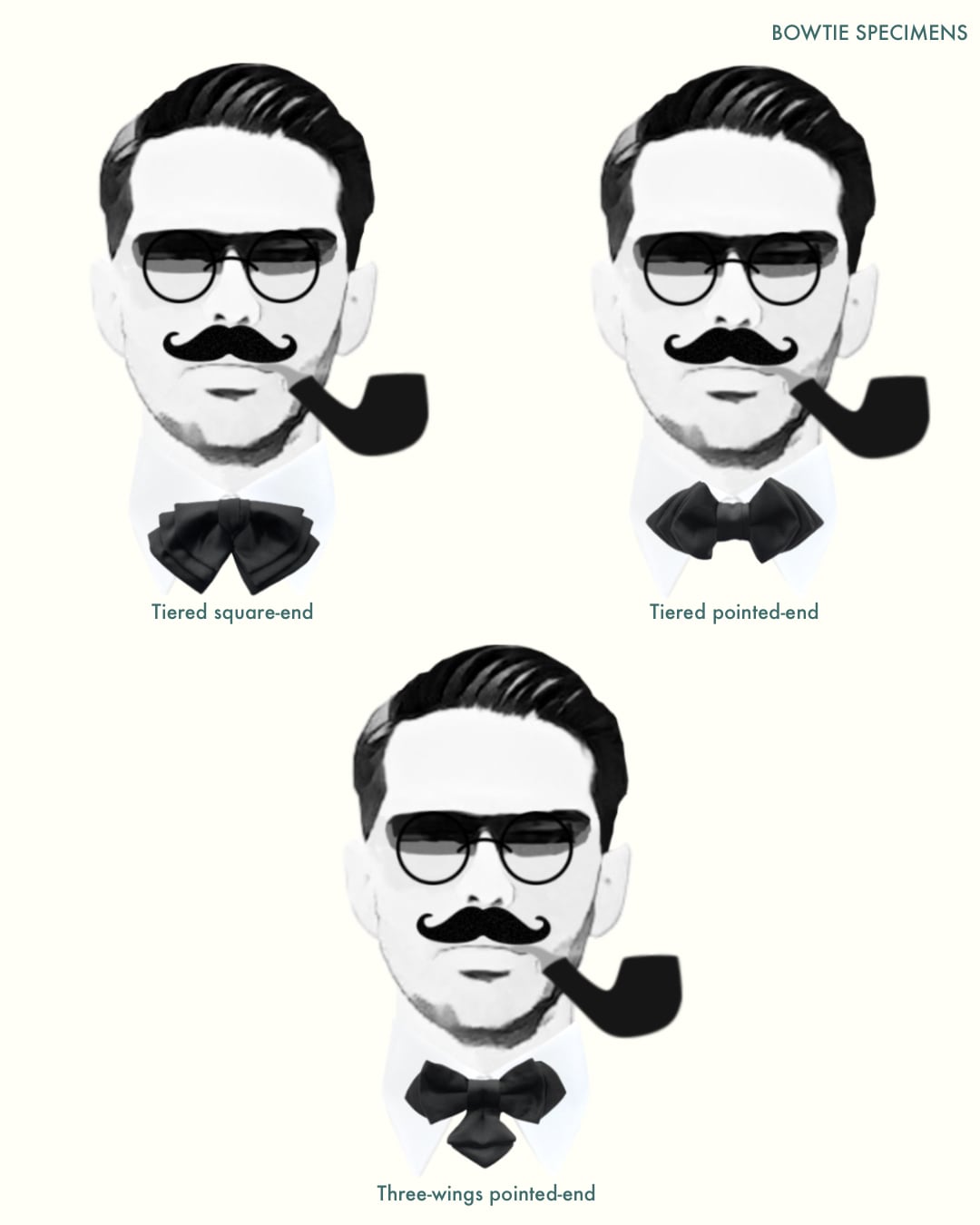 ★「ティアード・スクエアエンド形」は、「作り結びタイプ」の蝶ネクタイだけに作ることのできるシルエットです。歴史的には、蝶ネクタイ(Bow tie)という言葉が生まれる1850年代よりも、約200年ほど前にフランスのルイ14世が、層状形(Tiered)の赤いリボンのネックウェアを装い、当時のメンズファッションで流行させたと考えられます。