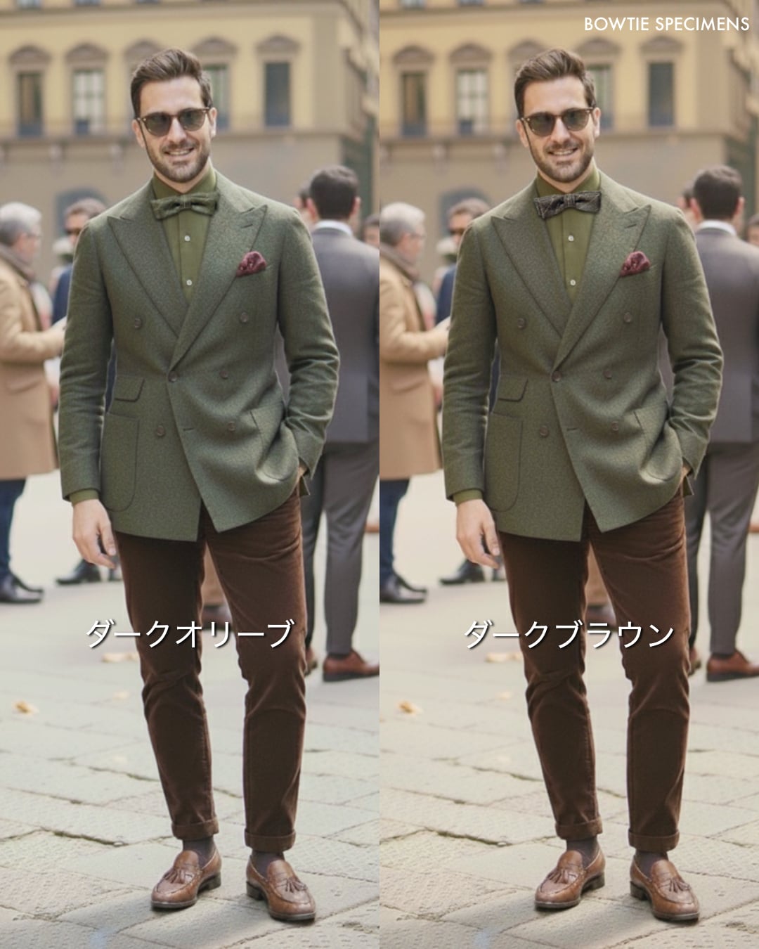 細い 蝶ネクタイ 英国ウール ナロー・スクエアエンド (ダークオリーブ&ブラウン/ストライプ) 作り結び型〈緑 グリーン 茶色〉