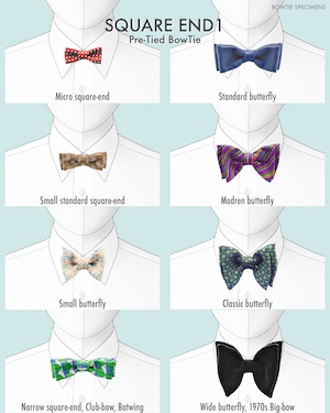 ★「Butterfly(バタフライ)」は「蝶」を意味しますが、バタフライ形はあくまで数ある蝶ネクタイの形の1つです。明治期の日本において、本来は「bow tie(蝶結びのネクタイ)」という意味の単語を、「蝶ネクタイ」と訳したことで、シンプルな蝶形(バタフライ形)だけが「蝶ネクタイ」であると印象付けられたと推測されます。